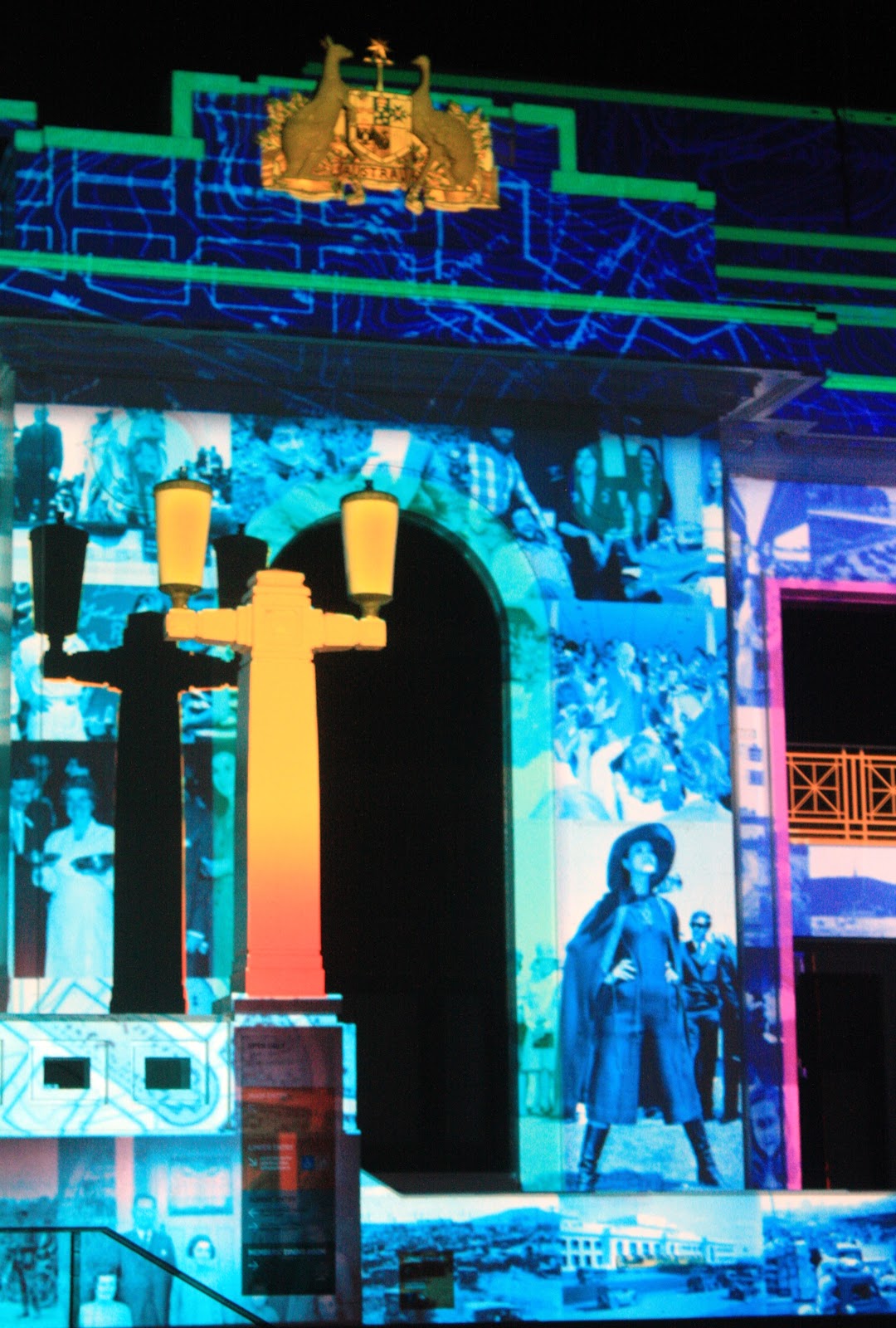 I have mentioned before that I find Canberra's public buildings a bit dull and uniform. This, however, makes them ideal canvases for the festival 'Enlighten'. It lasts for a week and images are projected onto their surfaces to bring the buildings to life. The projection artists are Betty Holdsworth, David Sequeira, Eleanor Gates-Stuart, Martin Ollman, and Houl.