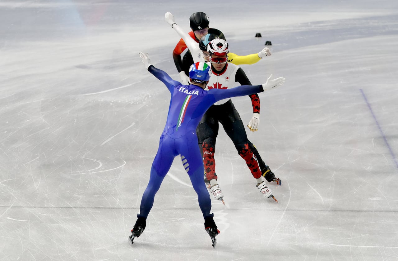 In the mens' short-track speed skating 500m there are wipeouts aplenty in every heat. It's like the Wacky Skaters - they're all going to get splattered! - an analogy that is only strengthened by the fact one of the skaters is called Pigeon and they are all trying to catch him in Heat 4. Everyone falls behind the Canadian, William Dandjinou, in Heat 1, but there are advancements to the final (if the athlete is brought down by another competitor and it is deemed that they might have progressed otherwise). In Heat 2, the Italian Pietro Sighel crosses the line backwards after a tangle of skates, but he still secures an automatic qualifying spot.